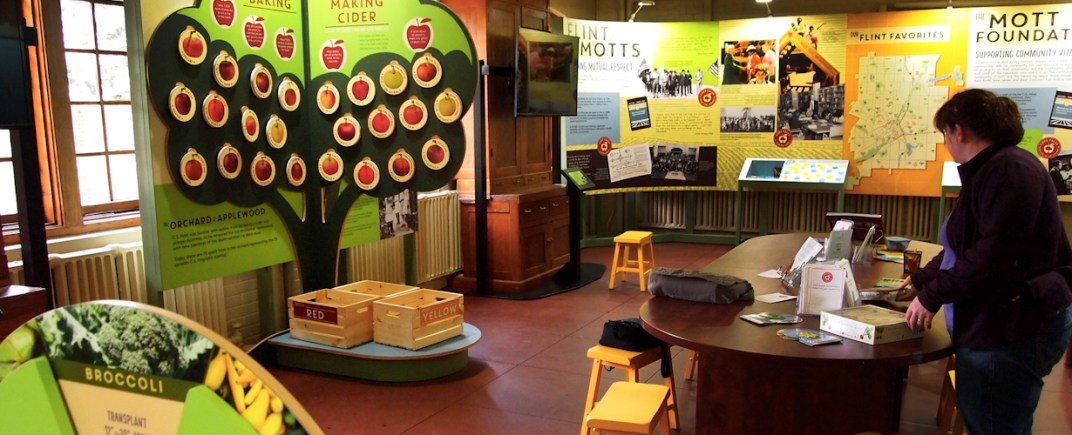 Multiple projects for Applewood—The Charles Stewart Mott Estate in Flint, Michigan included an exhibit in the historic garage, outdoor interpretive panels, new house and grounds tours, a new web site, a virtual tour developed for the web site and the garage exhibit, and introductory video as well as an exhibit on the history of the Mott family installed at the nearby Sloan Museum. The estate included a gentleman’s farm, which we interpreted for an audience unfamiliar with farm animals and practices.